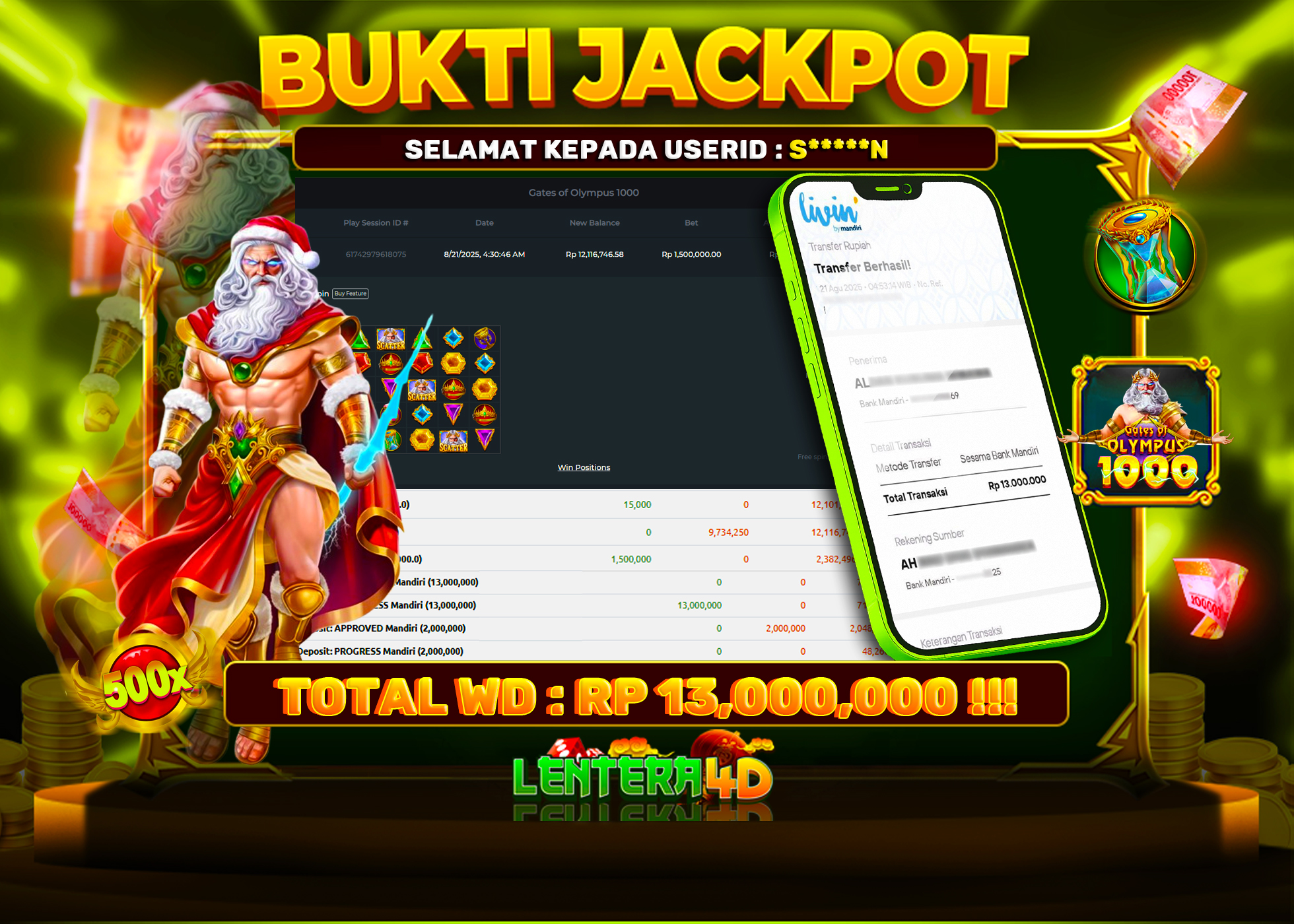 TOTAL KEMENANGAN : Rp. 13.000.000,-