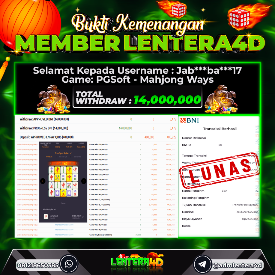 Satu lagi Bukti JP dan Pembarayan Sah Dan Dapat Dipertanggung Jawabkan, WD Berapapun Pasti Dibayar Lunas Hanya di Situs LENTERA 4D. Hati Hati Kepada Pihak Pihak Yang Mengatas namakan Pihak LENTERA4D Untuk Melakukan Penipuan.