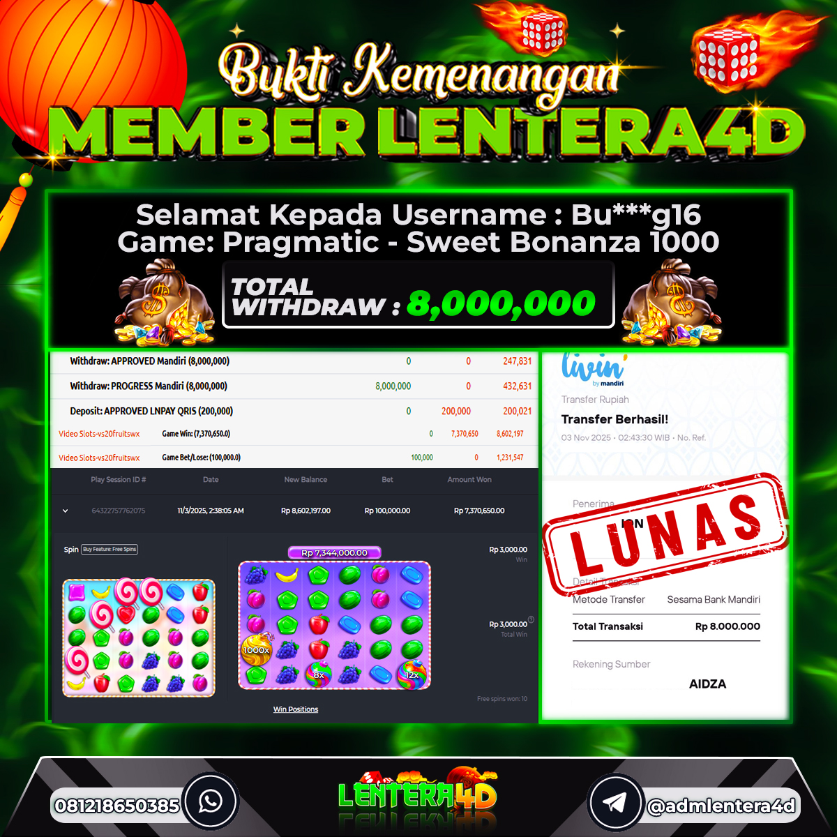 TOTAL KEMENANGAN : Rp 8.000.000,-