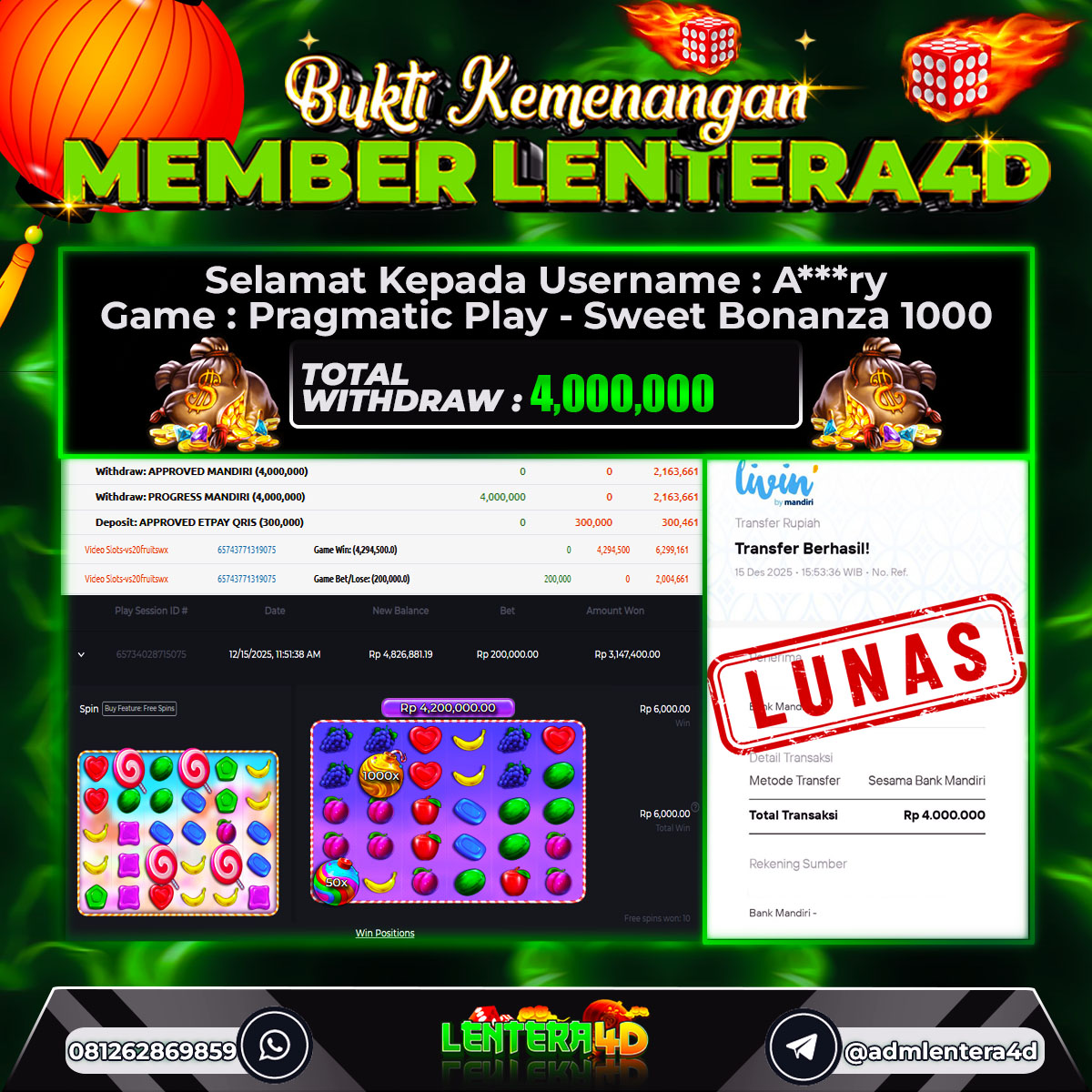 JACKPOT SWEET BONANZA 1000 15 DESEMBER 2025, Jackpot Slot Gacor, Kemenangan Slot, Bukti Kemenangan Slot, Kemenangan Slot PRAGMATIC PLAY, Menang Slot online, Slot Gacor, Situs Aman Terpercaya, WD Berapapun Pasti DI Bayar Tuntas, Maxwin Slot Online.